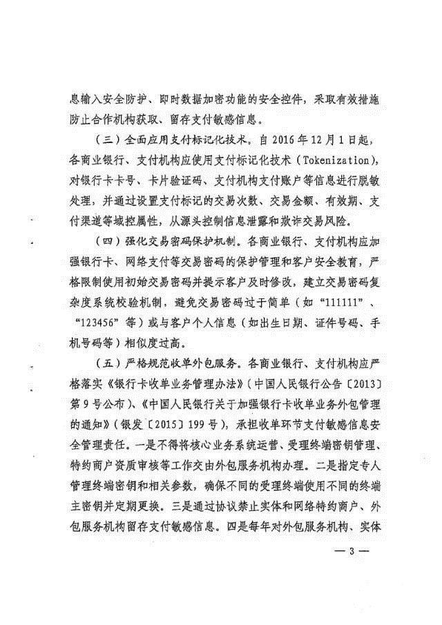 2016年12月1日起全面实行支付技术标记化处理支付机构应使用支付标记化技术 ,对银行卡卡号 、卡片验证码 、支付机构支付账户等信息进行脱敏处理 ,并通过设置支付标记的交易次数 、交易金额 、有效期 、支付渠道等域控属性 ,防范交易风险!